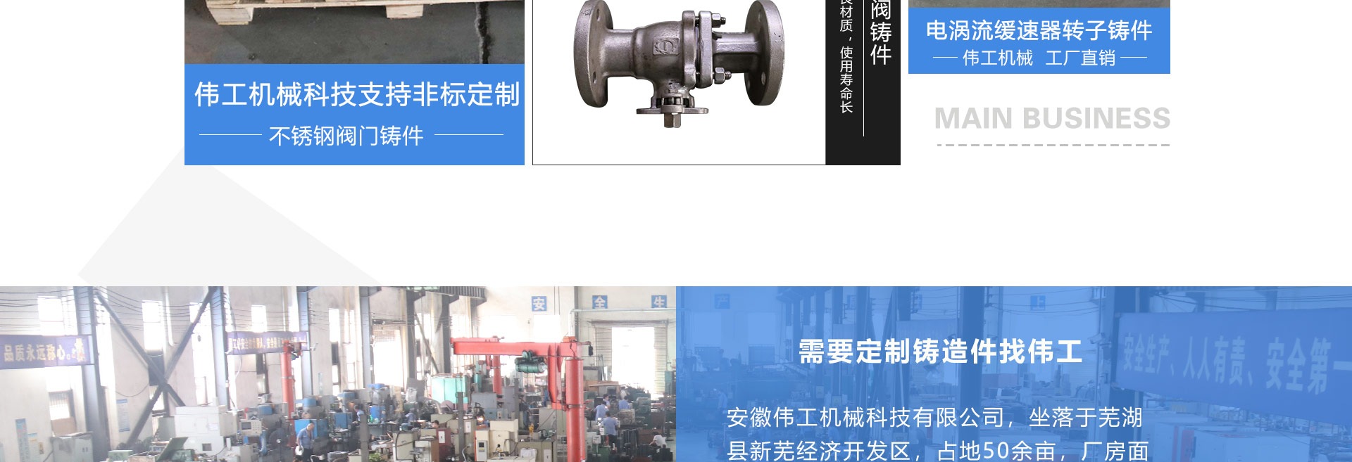 安徽偉工機(jī)械科技有限公司,坐落于安徽蕪湖新蕪經(jīng)濟(jì)開發(fā)區(qū),是一家専業(yè)從事鑄造產(chǎn)品設(shè)計、研發(fā)、生產(chǎn)、銷售于一體的企業(yè),公司為客戶的產(chǎn)品提供多樣的技術(shù)支持與設(shè)計,公司主要鑄造技術(shù)有潮模砂鑄造、硅溶膠精鑄工藝。主要產(chǎn)品有:不銹鋼閥門配件、泵閥配件、汽車配件、工業(yè)管道配件、工程機(jī)械配件、汽車配件等。材質(zhì)為:低合金鋼、304、316、316L、鉻鉬鋼、哈氏合金、碳鋼、雙相鋼等。公司已先后通過ISO9001和TS16949等多種體系審核,以完備的管理手段和齊全的檢測設(shè)備滿足客戶需求,進(jìn)的設(shè)備,専業(yè)的技術(shù),嚴(yán)謹(jǐn)?shù)墓芾?,穩(wěn)定的質(zhì)量。服務(wù)客戶,鑄造未來,偉工誠摯的歡迎新老客戶共同商洽合作